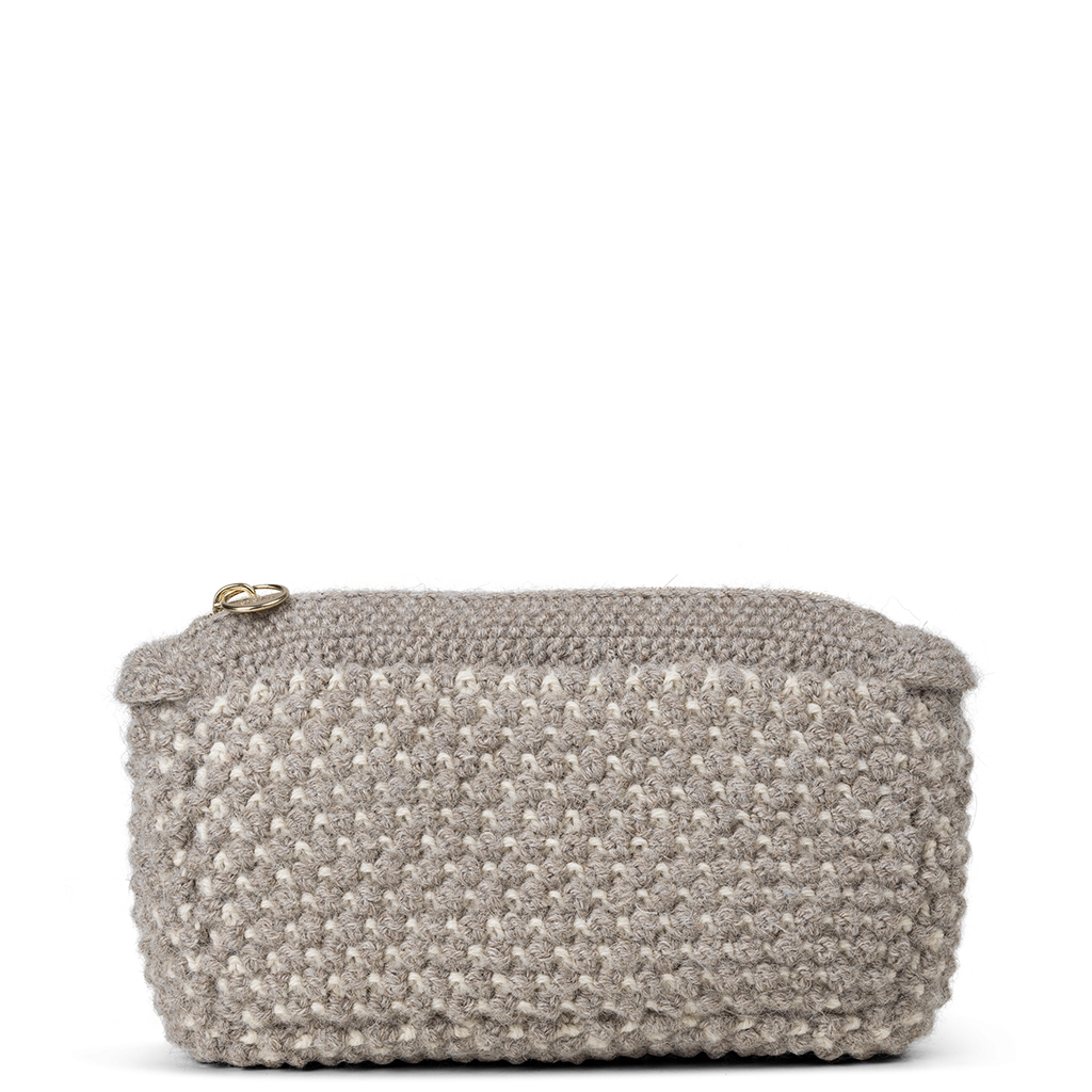 Opdag Aiayu Helen Classic Mix Nougat/Albicant - en tidløs bestseller clutch fremstillet af 100% luksuriøs lamauld. Denne elegante clutch er håndstrikket i Bolivia og byder på en unik boblestrik med hæklet top. Designet inkluderer praktiske funktioner som lynlåslukning, en indvendig lomme og en blød bomuldsforing. Farven Mix Nougat/Albicant tilføjer en stilsikker nuance til både dagligdags og festlige looks. Perfekt til opbevaring af dine essentielle småting. Bæredygtigt produceret, dette er et must-have tilbehør for den miljøbevidste forbruger.