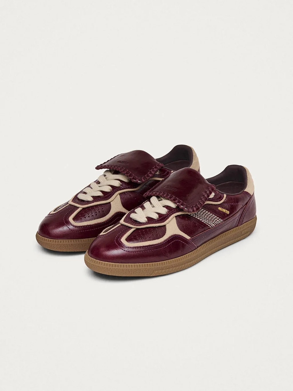 Opdag elegance og komfort med Alohas Tb.490 Club Onix Deep Burgundy Leather Sneakers. Fra Alohas' innovative Tb.490-serie, disse sneakers inkorporerer en foldbar pløs, inspireret af klassiske fodboldsko, tilførende et sporty, men chikt udtryk. Fremstillet i luksuriøst bordeauxrødt laklæder med cremefarvede kontrastkanter, er de designet med en lav profil og robuste gummisåler. Perfekte til både forår og sommer, kombinerer disse sneakers ægte læders kvalitet med subtile farvevariationer, der fremhæver deres unikke karakter. Ideal til den modebevidste kvinde, der værdsætter kvalitet og stil.
