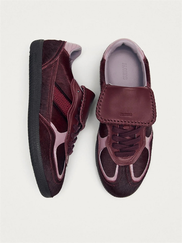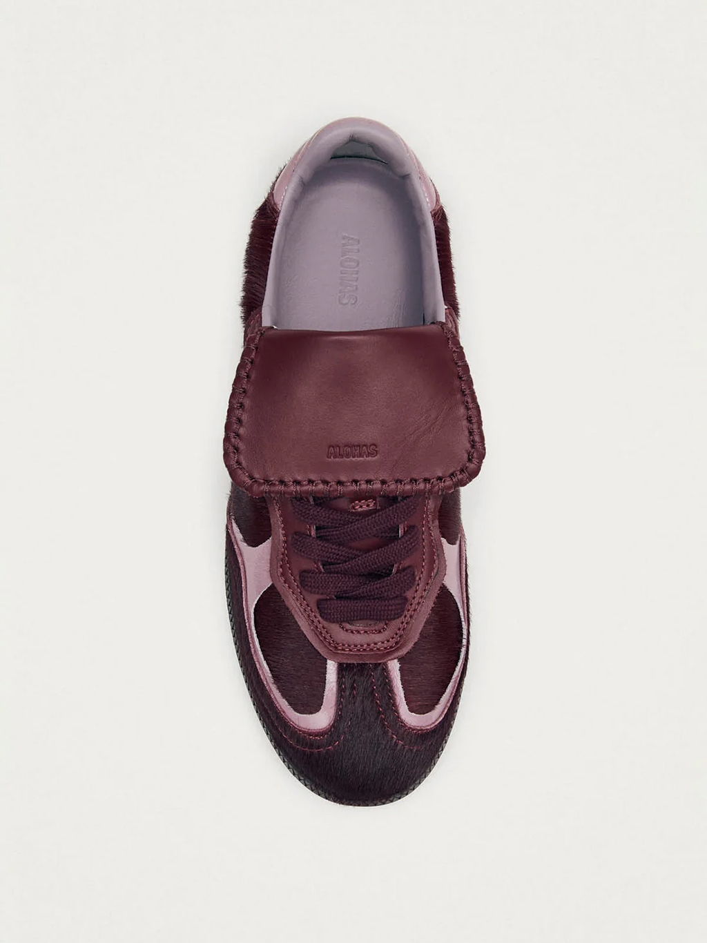 Oplev elegance og komfort med Alohas Tb.490 Club Soft Burgundy Leather Sneakers. Disse stilfulde sneakers, fremstillet af førsteklasses bordeauxrødt kalvehår og accentueret med lilla læderkanter, tilbyder en unik fold-over læderpløs inspireret af klassiske fodboldstøvler. Designet til efterår/vinter kollektionen, de kombinerer bæredygtighed og luksus med 100% kolæder i overdel, for og indersål, samt holdbare gummiydersåler. Perfekt til den modebevidste kvinde, der værdsætter både æstetik og kvalitet.