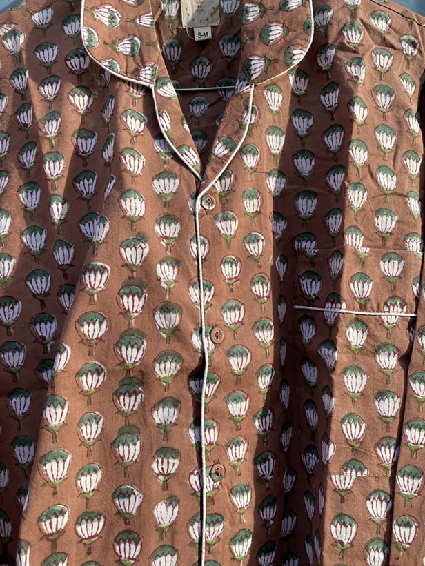 Oplev den ultimative komfort med Craft Sisters Classic Pyjamas i Blockprint Chocolate. Denne elegante og bløde pyjamas er håndfremstillet i Jaipur, Indien, ved hjælp af den traditionelle bloktrykteknik. Hver træklods med udskårne mønstre dyppes i naturlige farvestoffer for at skabe et unikt, håndlavet udtryk. Fremstillet i 100% bomuld, tilbyder denne pyjamas en løs pasform med vide ben og elastisk linning, ideel til afslappende hjemme. Farven er dyb chokoladebrun, perfekt til efterår/vinter kollektionen. Inkluderer en matchende stofpose. Størrelser: s/m (36-38) og m/l (40-42). Maskinvask ved 30 grader.