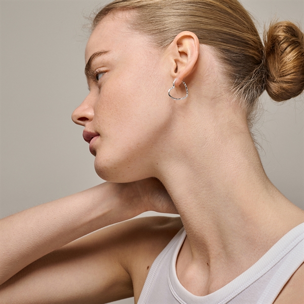 Oplev elegance og finesse med 'Enamel Copenhagen Organic Heart Medium Hoops' i 925 sterlingsølv. Disse mellemstore creoler, formet som delikate hjerter, kombinerer moderne design med klassisk håndværk. Det unikke, håndlavede overflade tilføjer en eksklusiv følelse, mens deres diskrete profil sikrer en underspillet charme fra enhver vinkel. Perfekte til at fejre kærlighed - uanset om det er selv-kærlighed eller til en nær person. Gør ethvert øjeblik specielt med disse sølvøreringe, designet til at komplementere både dagligdags og festlige looks.