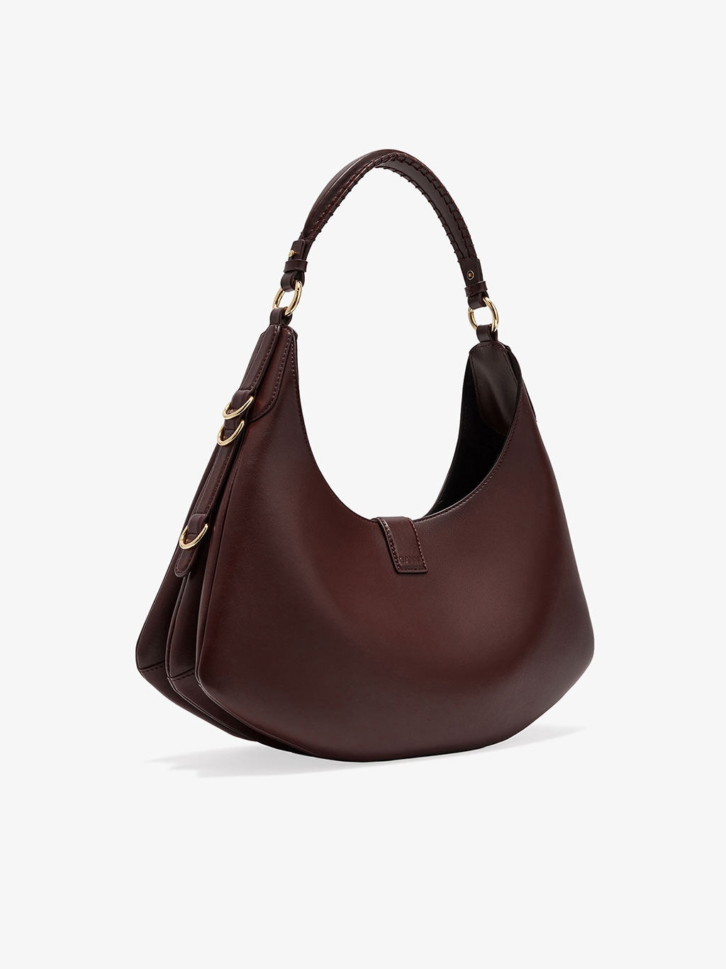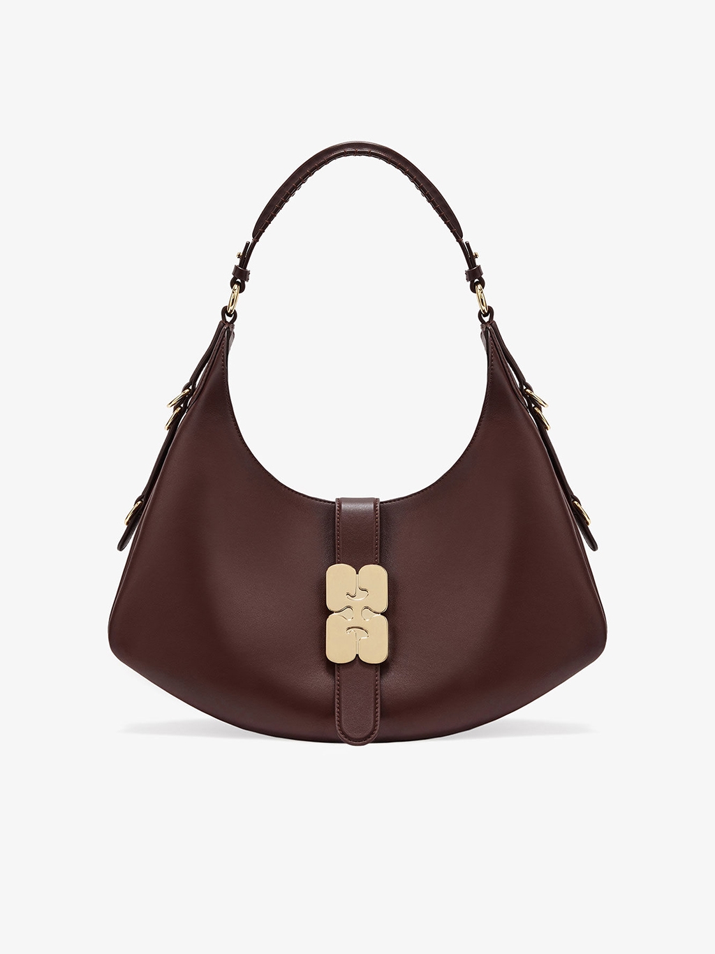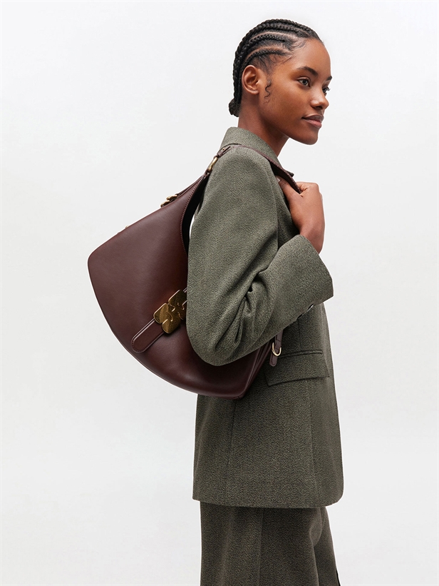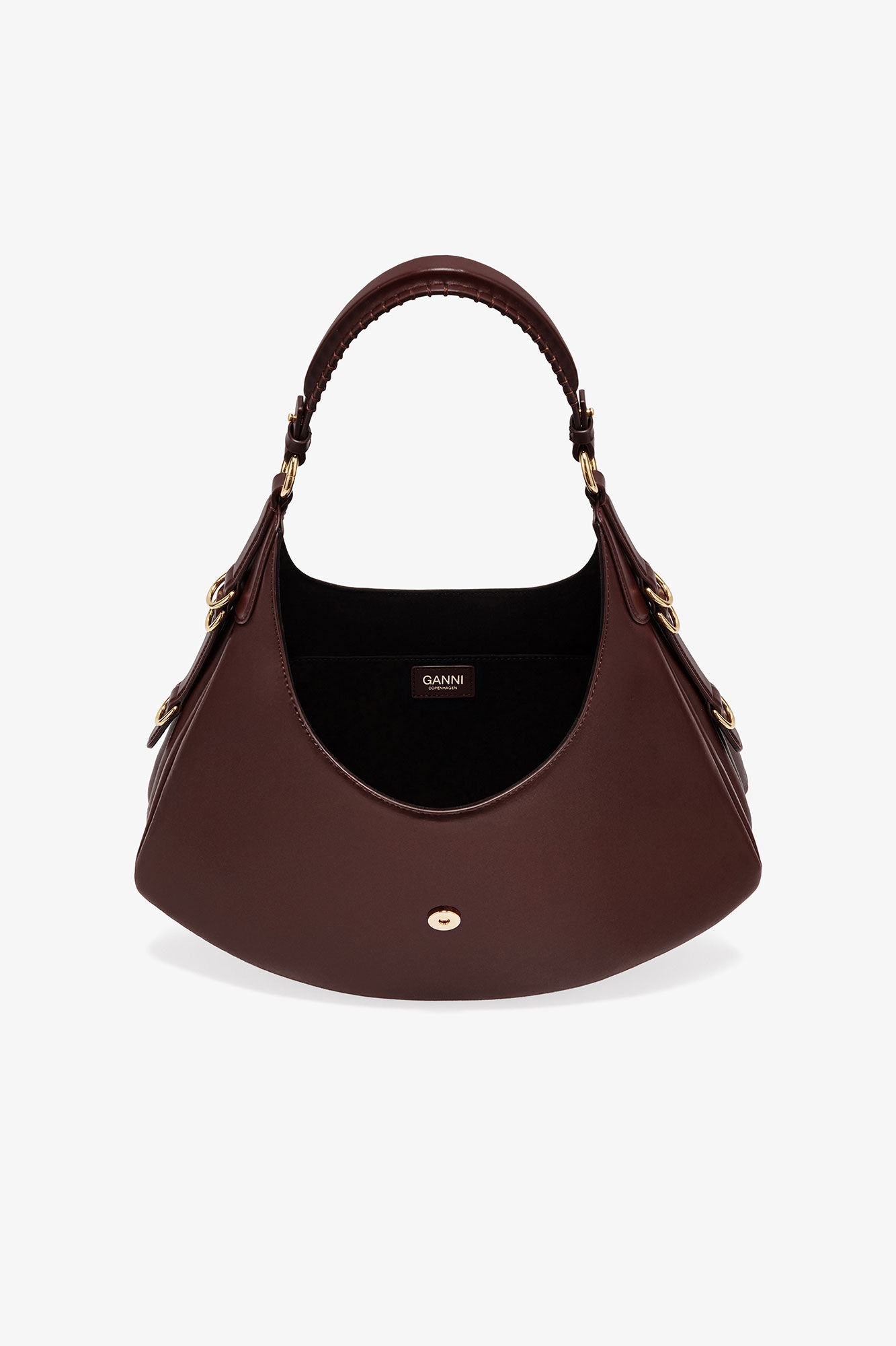 Oplev elegance og bæredygtighed med Ganni A7302 Kat Small Bag i farven Chicory Coffee. Denne taske præsenterer en unik harmonikastil silhuet, akkompagneret af en justerbar skulderrem og karakteristiske D-ring detaljer. Frontflappen lukkes sikkert med et iøjnefaldende guldfarvet GANNI Butterfly-signaturspænde. Indvendigt byder hovedrummet på praktisk opbevaring sammen med en åben lomme. Fremstillet af 65% genbrugslæder, 19% polyurethanfibre og 16% polyester, med et foer af 85% genbrugspolyester, understreger denne taske Gannis dedikation til ansvarlige materialer. Ideel til både efterår/vinter og forår/sommer kollektionerne.