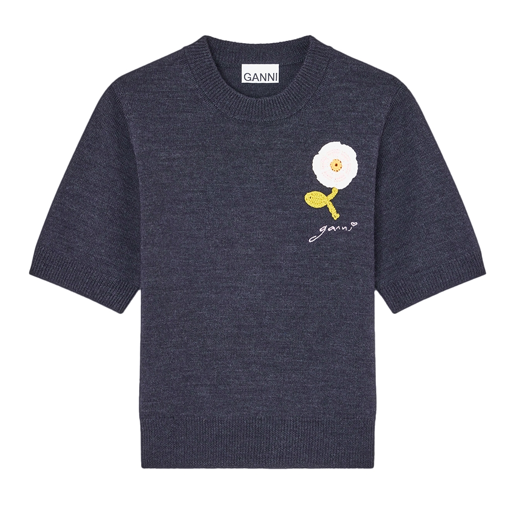 Ofte stillede spørgsmål om Ganni Crochet Applique merino tee Phantom