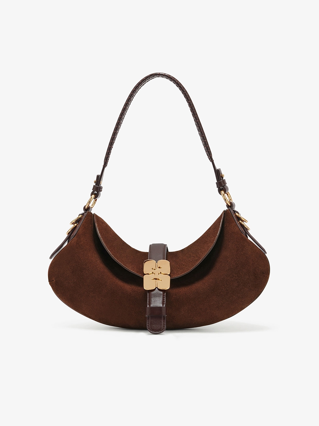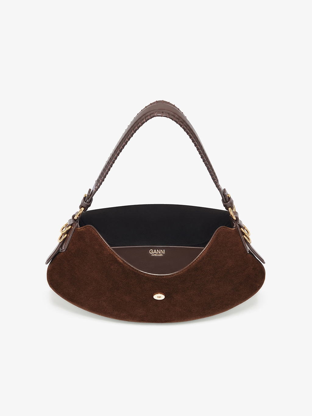 Opdag den elegante 'Ganni Kat Baguette Suede Chicory Coffee' taske, perfekt til den stilbevidste kvinde. Denne taske er fremstillet med et fokus på bæredygtighed, bestående af 60% genbrugslæder og 85% genbrugspolyester i foeret. Den har en karakteristisk buet silhuet, klaplukning med GANNI's ikoniske sommerfugl og praktisk skulderrem. Med dimensioner på 18 cm i højden, 4 cm i bredden og 36 cm i dybden, er denne taske ideel til at rumme dine essentielle genstande som mønter, nøgler og læbestift. Farven 'Chicory Coffee' tilføjer et tidløst touch til enhver garderobe.