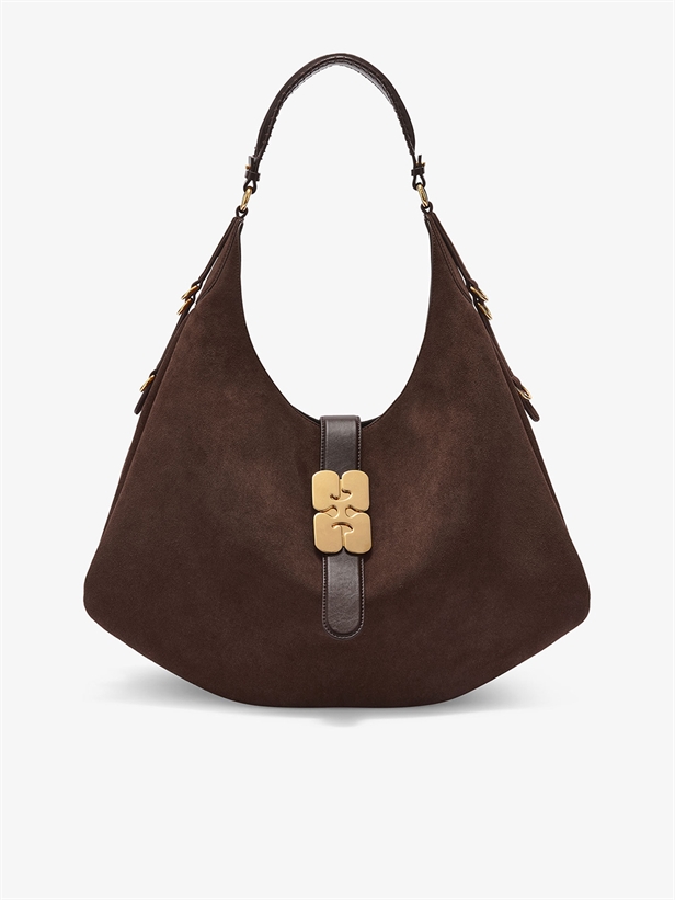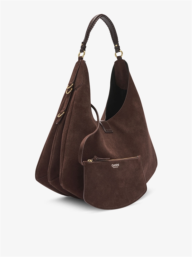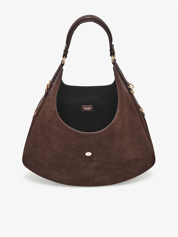 Opdag elegance og bæredygtighed kombineret i 'Ganni Kat Large Suede Chicory Coffee' tasken. Designet med en sofistikeret soufflet-silhuet, denne taske fremviser en justerbar skulderrem og stilfulde D-ringdetaljer. Frontflappen prydes af et iøjnefaldende, guldfarvet GANNI Butterfly-spænde. Indvendigt byder tasken på et hovedrum, en åben lomme og en aftagelig pose med lynlås, ideel til dagligdagens nødvendigheder. Fremstillet af 60% genbrugslæder og 85% genbrugspolyester, er denne taske et bevidst valg for den moderne kvinde. Farven 'Chicory Coffee' tilføjer en dybde og varme, der komplimenterer enhver garderobe.