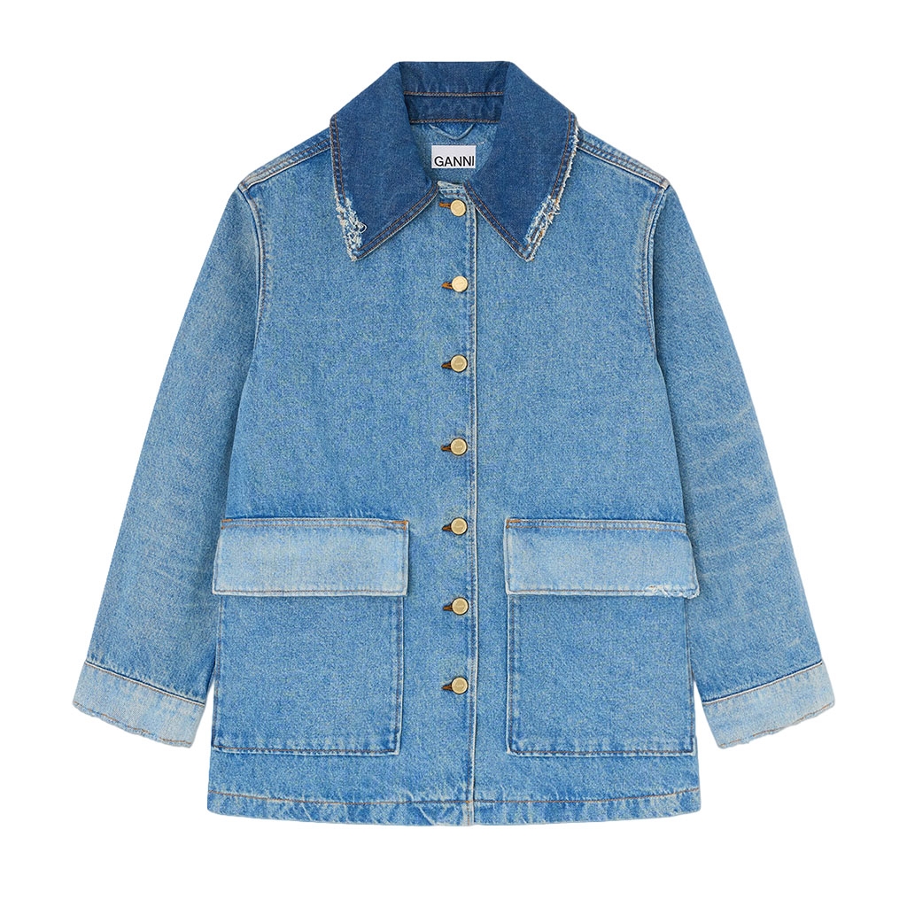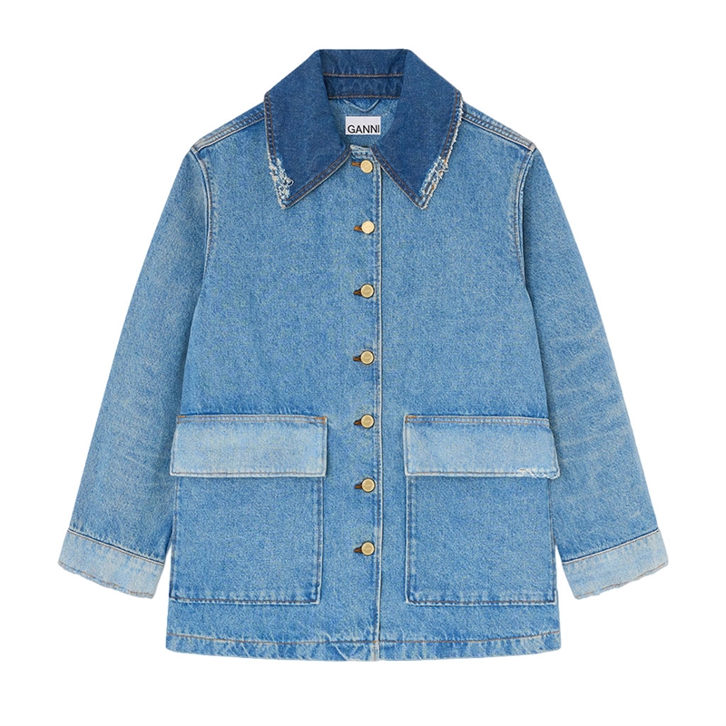 Ofte stillede spørgsmål om Ganni Patchwork Denim Midi Jacket Mid Blue Vintage