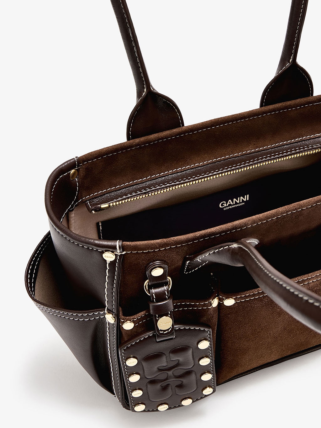 Ofte stillede spørgsmål om Ganni Posy Small Recycled Suede Chicory Coffee