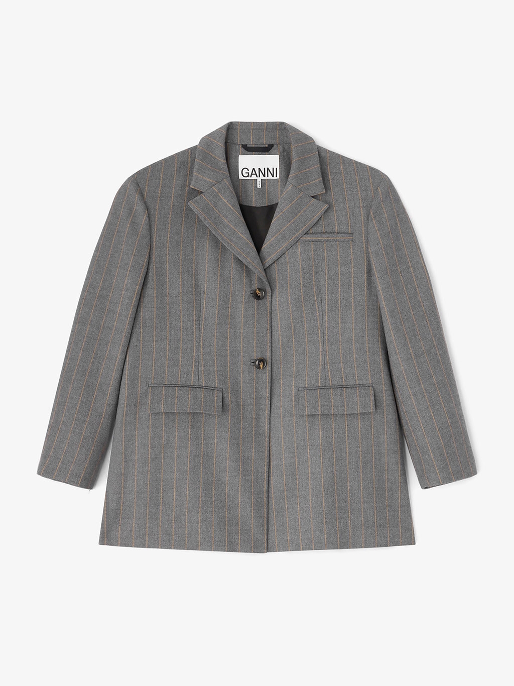 Oplev den elegante Ganni Wool Stripe Blazer Pewter Melange, som kombinerer tidløs stil med bæredygtighed. Denne blazer er fremstillet af 42% uld, 41% genanvendt polyester og 17% LENZING™ ECOVERO™ viskose, hvilket sikrer både miljøvenlighed og holdbarhed. Med dens afslappede pasform og klassiske grå 'Pewter Melange' farve, er den ideel til både efterår/vinter og forår/sommer kollektionerne. Et must-have for den modebevidste kvinde, der værdsætter kvalitet og ansvarlighed i sit tøjvalg.