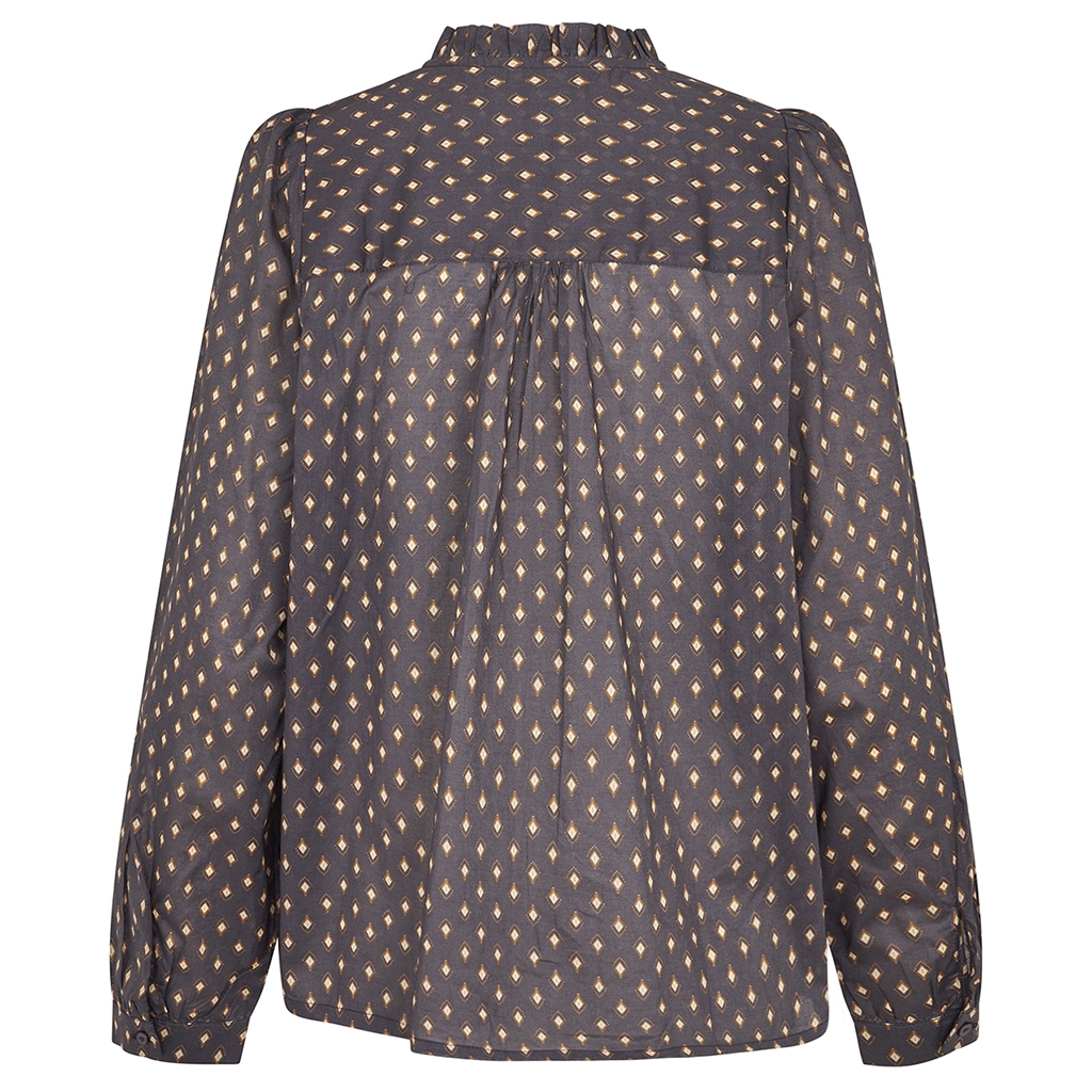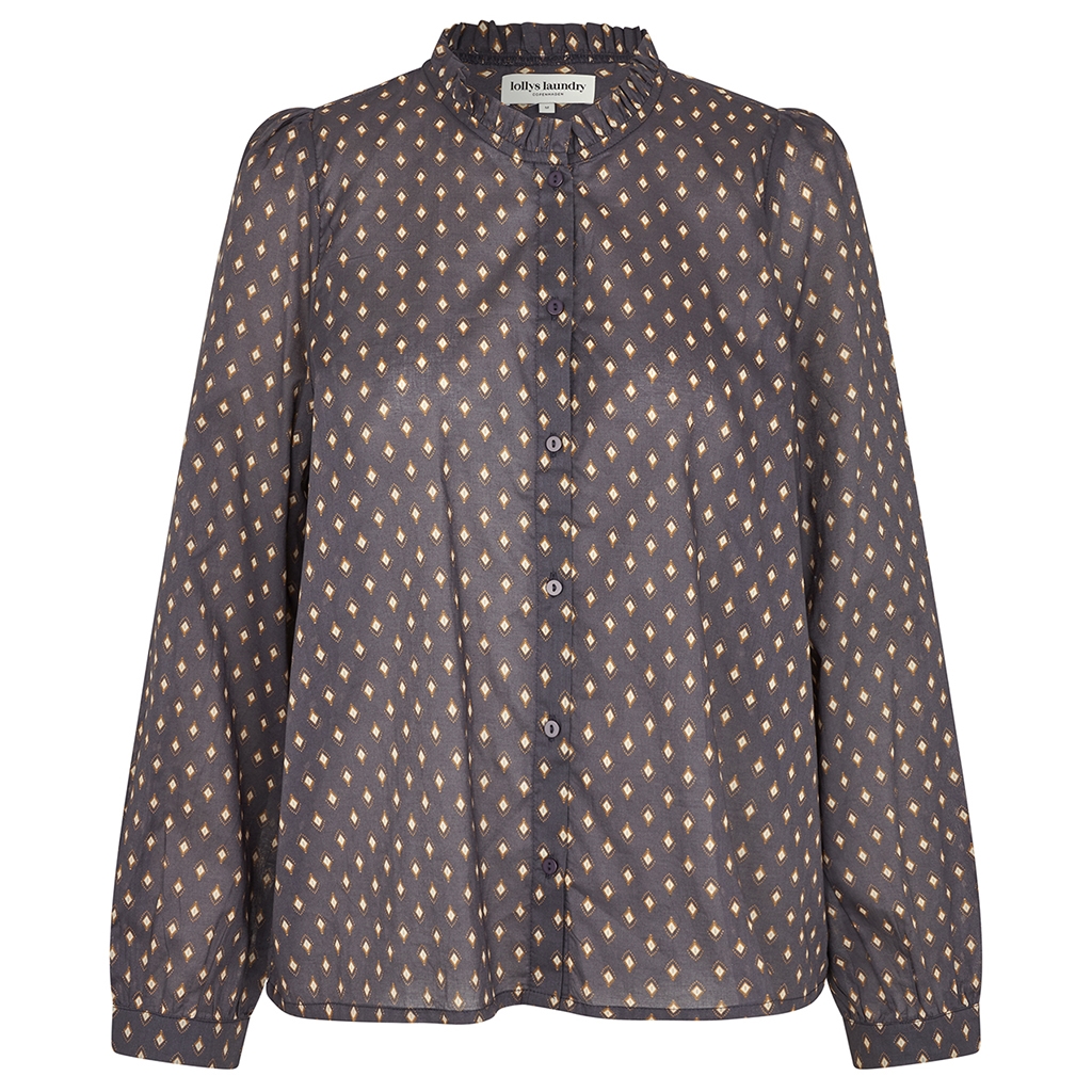 Opdag elegance og komfort med 'Lollys Laundry RiverLL Shirt LS' i mørkeblå. Denne klassiske skjorte er fremstillet af 100% bomuld, hvilket sikrer en blød og åndbar kvalitet. Det tidløse print og de subtile, feminine detaljer som flæser ved kraven og fine læg ved skuldrene, tilføjer et stilfuldt touch. Ideel til både hverdagsbrug og særlige anledninger. Skjortens regular fit sikrer en afslappet og flatterende pasform. Gør din garderobe unik med denne skjorte fra Lollys Laundry.