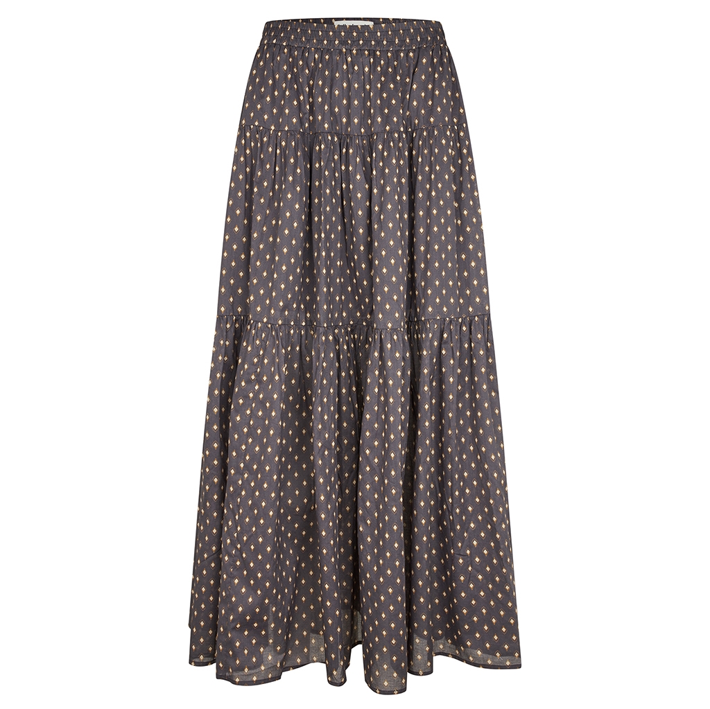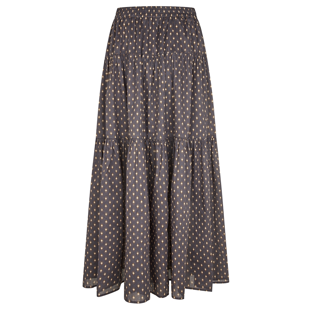 Opdag elegance i hver detalje med 'Lollys Laundry SunsetLL Maxi Skirt' i mørkeblå. Denne smukke, lange nederdel, fremstillet af 100% bomuld, tilbyder en blød og åndbar kvalitet, der sikrer optimal komfort. Det lagdelte design og den elastiske linning fremhæver figuren med en flatterende pasform. Perfekt til at skabe et ensartet sæt med RiverLL-skjorten. Ideel til både efterår og vinter, denne regular fit nederdel er et must-have til enhver modebevidst kvinde. Vælg en størrelse op, hvis du er mellem to størrelser, for at sikre den bedste komfort.