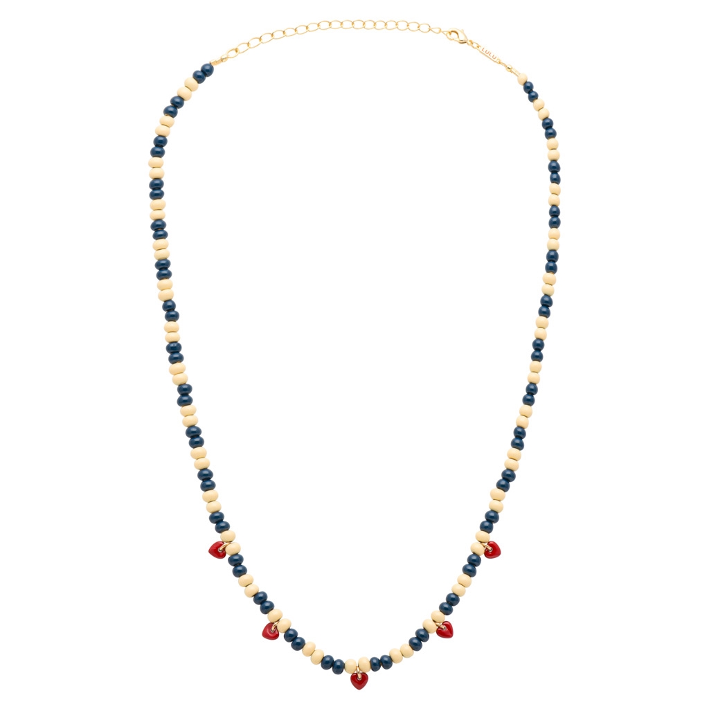 Oplev den charmerende elegance med 'Lulu Copenhagen Color Ball Heart Necklace' i bløde gule og retro mørkeblå nuancer. Dette fine smykke er omhyggeligt sammensat af 18K forgyldt messing, inkluderende 50% genanvendt materiale, og prydet med håndmalede perler samt emaljerede hjerter, der tilføjer et personligt touch. Kædens længde er 40 cm med en ekstra 6 cm forlænger, så den kan justeres til at passe perfekt. Ideel til den stilbevidste kvinde, der værdsætter både kvalitet og bæredygtighed i hendes tilbehør. Vær unik og fremhæv din feminine stil med dette eksklusive stykke fra LULU Copenhagen.