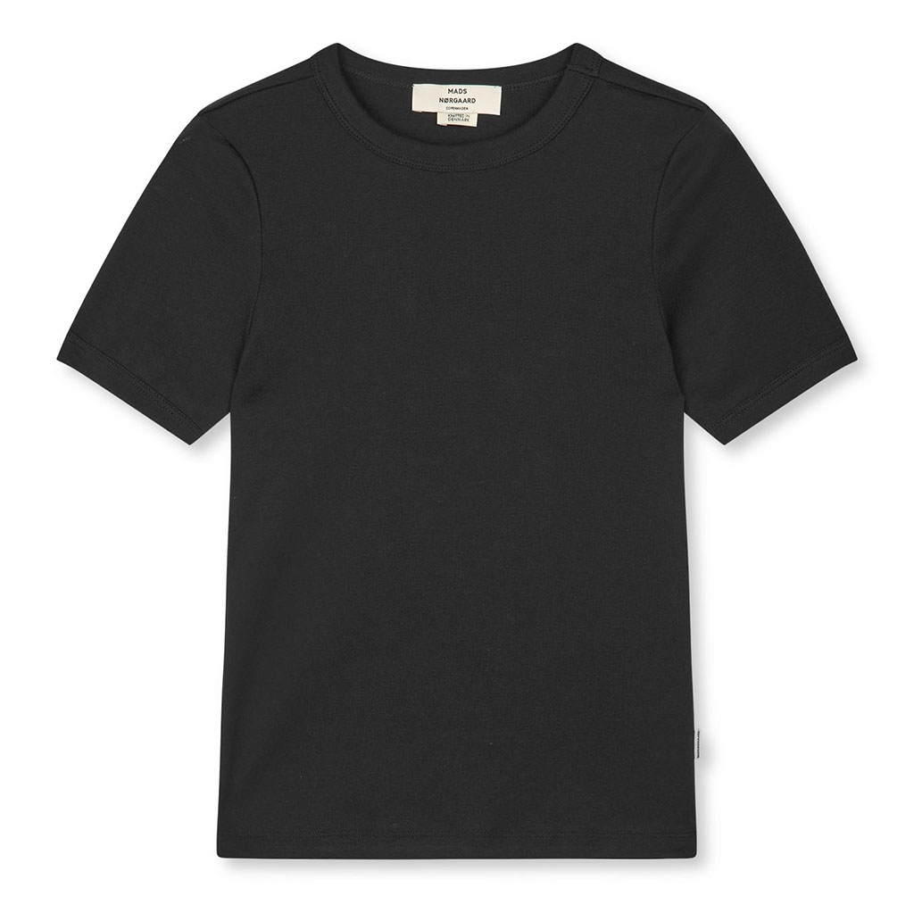 Opdag den stilfulde 'Mads Nørgaard Grace Jersey June Tee' i klassisk sort, et must-have i enhver kvindes garderobe. Denne T-shirt er fremstillet af 100% blød bomuldsjersey og designet med en figursyet pasform, der fremhæver din silhuet elegant. Perfekt til både forår og sommer, tilbyder denne top en kombination af komfort og tidløs æstetik. Med sit rene snit og høje kvalitetsmateriale sikrer den både holdbarhed og stil. Tilføj et strejf af Mads Nørgaards karakteristiske skandinaviske minimalisme til din daglige påklædning med denne alsidige og fashionable tee.