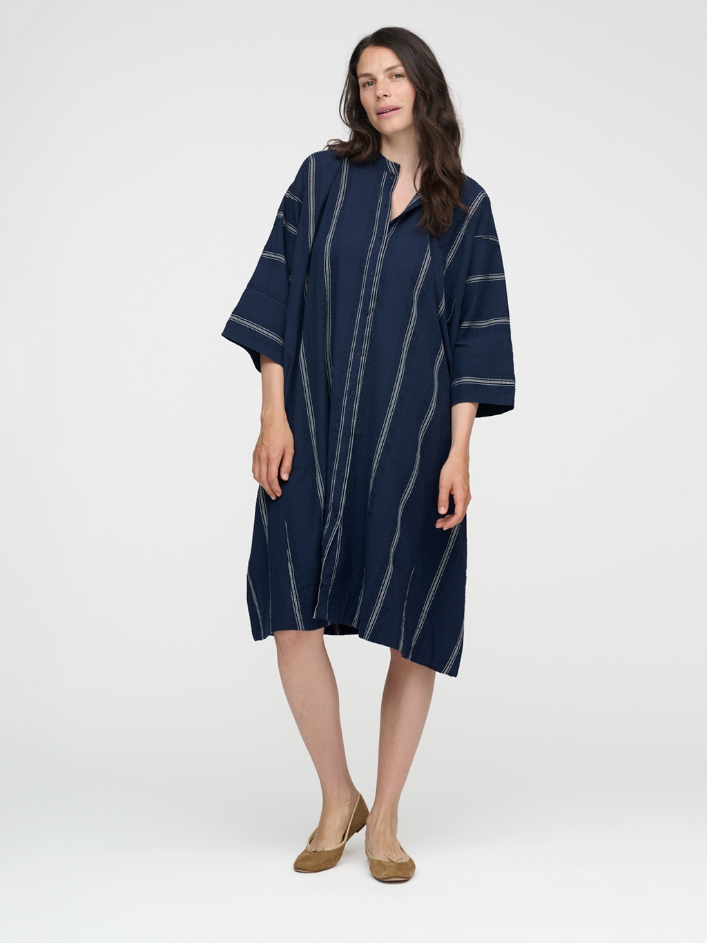 Oplev elegance og komfort med Moshi Moshi Mind Lively Shirtdress i striber af mørkeblåt og hvidt. Denne A-formede skjortekjole er designet med en afslappet pasform, en diskret kinakrave og voluminøse trekvart-længde ærmer. Fremstillet i 100% økologisk bomuld, understreger den bæredygtige værdier med ansvarligt indkøbte materialer. Kjolen har en fuld knaplukning foran og dekorative fald, der tilføjer en raffineret finish både foran og bagtil. Perfekt til både forår og sommer, kombinerer denne kjole stil med miljøbevidsthed.
