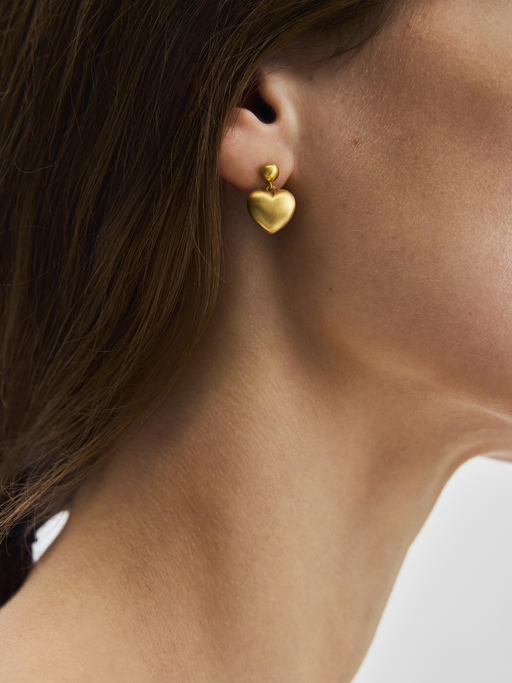 Opdag elegance og romantik med Pernille Corydon Desire Øreringe, perfekt til både hverdagsbrug og festlige lejligheder. Disse øreringe præsenterer et iøjnefaldende chunky hjerte design, der elegant hænger fra en kuglerund ørestik. Fremstillet af 92% genanvendt messing med en forgyldning af 18 karat guld, tilbyder de en miljøvenlig luksus. Den matte, silkebørstede overflade tilfører et sofistikeret touch, der komplementerer det feminine formsprog. Mål: Længde 18 mm, hjerte 12 mm, kugle 4 mm. En tidløs tilføjelse til enhver smykkesamling.