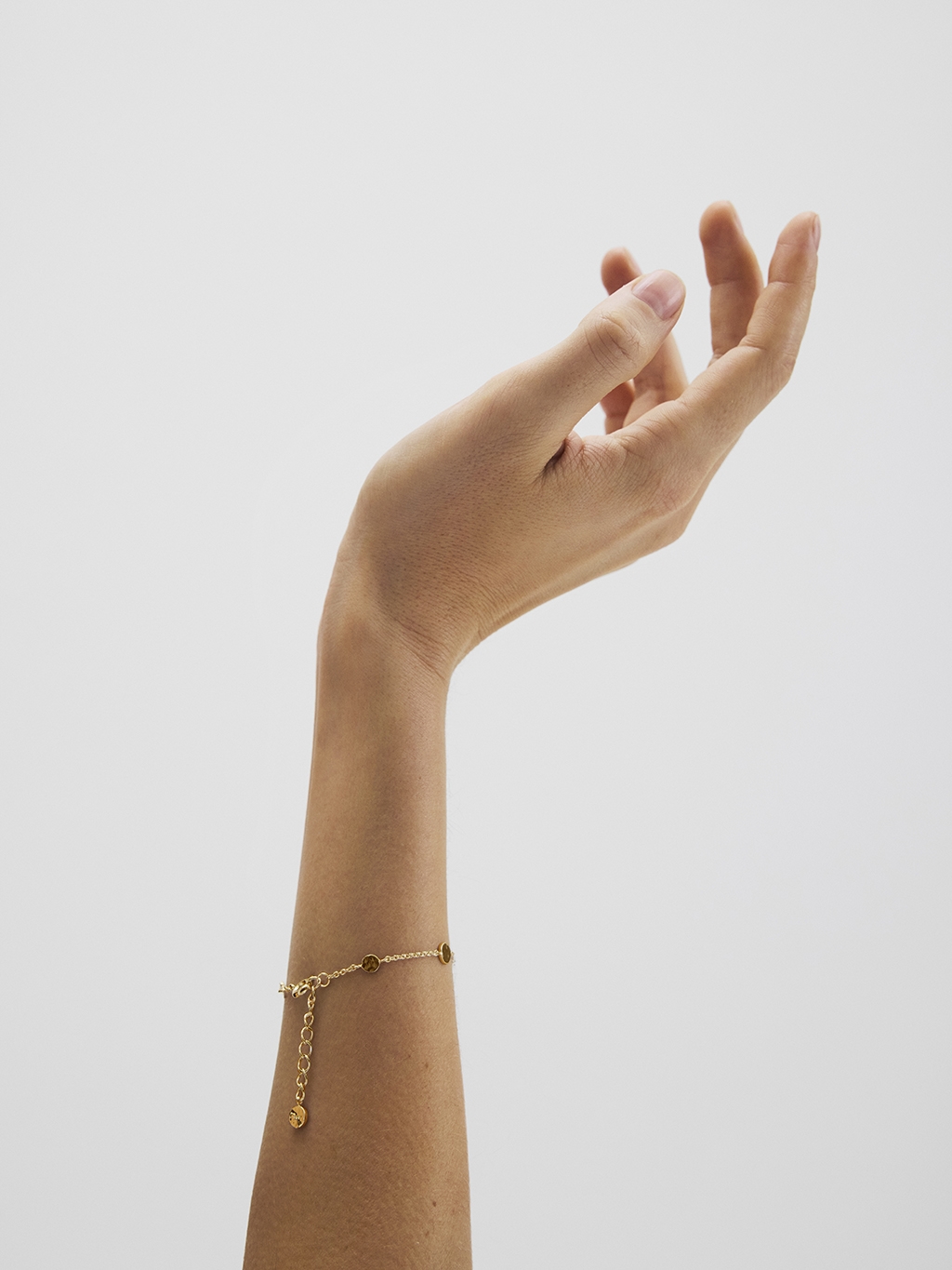 Oplev den sofistikerede elegance med 'Pernille Corydon Dot Bracelet'. Dette forgyldte messingarmbånd til kvinder, justerbart fra 16 til 19 cm, fremviser syv delikate prikker i størrelser fra 4 til 6 mm, der smukt reflekterer lyset. Inspireret af den grafiske enkelhed og organiske blødhed i cirkelens formsprog, tilbyder dette armbånd en perfekt balance mellem stram grafik og levende dynamik. Ideel til at bære alene eller i kombination med andre armbånd for et personliggjort look. Tilgængelig hele året, er det en tidløs tilføjelse til enhver smykkesamling.
