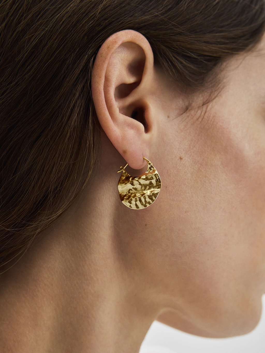 Opdag elegance og raffinement med 'Pernille Corydon Halo Earrings 22 mm Guld'. Disse øreringe fremstår med en højpoleret, banket overflade, der fanger og reflekterer lyset for en imponerende effekt. Den runde form omslutter øreflippen med et diskret, men karakterfuldt design. Ideelle til både hverdagsbrug og festlige anledninger, tilbyder disse øreringe en perfekt balance mellem minimalistisk stil og iøjnefaldende detaljer. Fremstillet i forgyldt messing, er de et must-have tilbehør til enhver modebevidst kvinde.