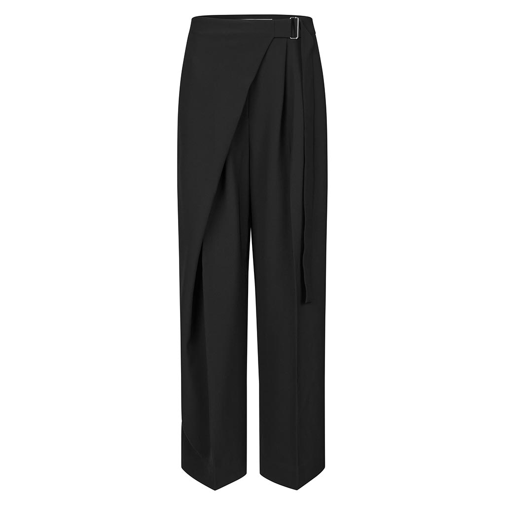 Opdag elegance og komfort med Second Female Fique Wrap Bukser i sort. Disse bukser er designet med en mellemhøj talje og har vide, lige ben, der skaber en flatterende silhuet. Fremstillet af en blanding af 62% polyester, 30% genbrugt polyester og 8% elasthan, sikrer en glat og draperet tekstur. En unik diagonal wrap-detalje med spændelukning på siden tilføjer et moderne twist. Ideelle til både kontor og aftenbrug, disse bukser kombinerer stil med bæredygtighed i kollektionen for efterår/vinter.