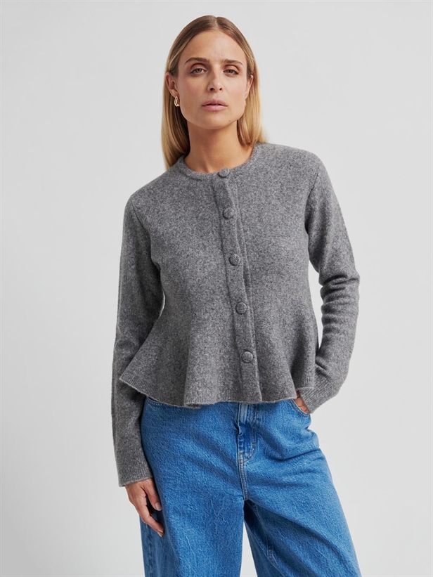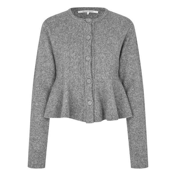 Oplev elegance og komfort med 'Second Female Hiva Peplum Knit Cardigan' i farven Mid Grey. Denne cardigan er omhyggeligt fremstillet i en luksuriøs blanding af 60% uld og 40% polyamid, hvilket sikrer både varme og holdbarhed. Designet med en raffineret peplum-talje, skjulte knapper og en ribstrikket krave, tilbyder den en flatterende og stilfuld pasform. Perfekt til både forårs- og sommerbrug. Kombiner med dine yndlingsjeans eller en elegant nederdel for et sofistikeret look.