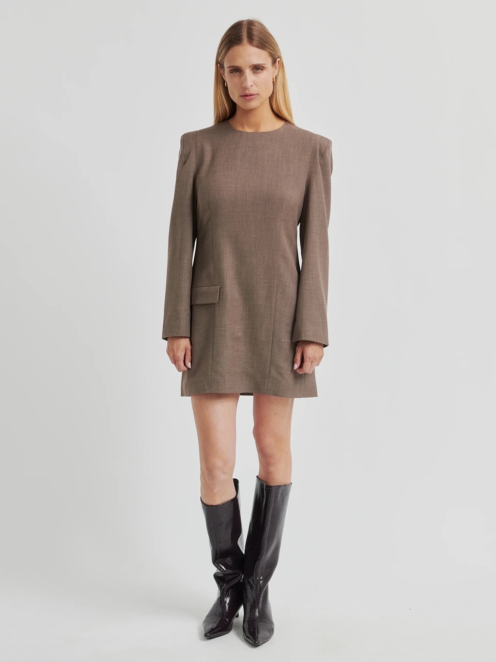 Oplev den elegante 'Second Female Oline Tailored Dress' i Mid Brown Melange. Denne langærmede kjole er skræddersyet i et let habitmateriale, der sikrer både komfort og en flatterende pasform. Designet med skjult lynlås, praktisk klaplomme og vatterede skuldre, som tilføjer en moderne kant til den klassiske silhuet. Figursyede sømme foran og bagpå fremhæver din silhuet. Ideel til både forårs- og sommergarderoben.