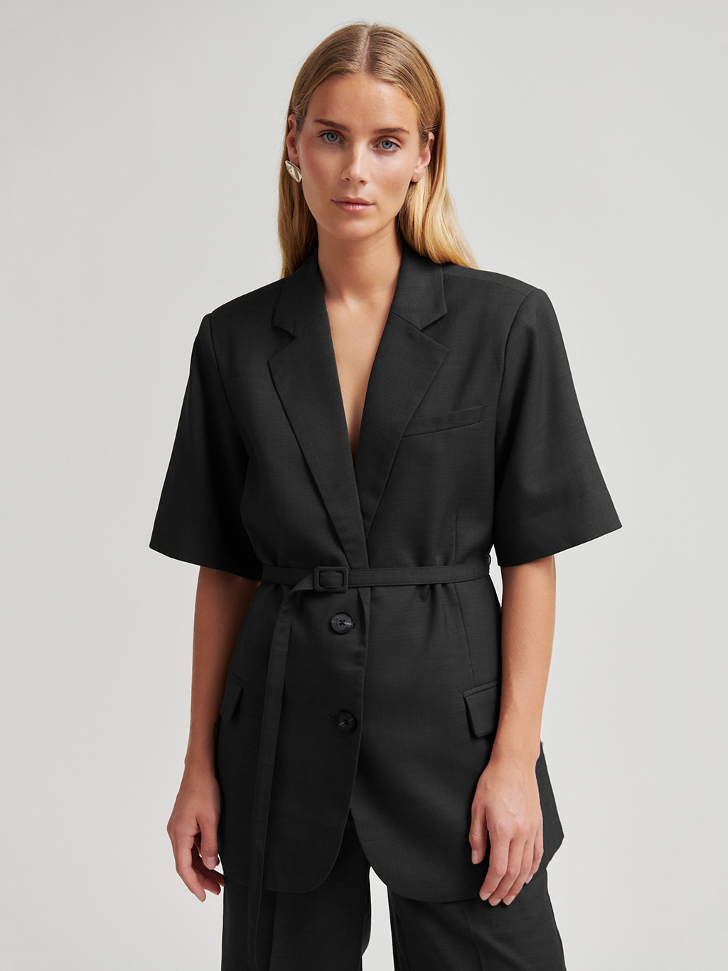 Opdag elegance og komfort med 'Second Female Sharo New SS Blazer' i sort. Denne moderne kortærmet blazer er designet til forår og sommer brug. Fremstillet af en letvægtsblanding af 68% polyester, 30% viskose og 2% elasthan, tilbyder den en behagelig, men skarp pasform. Detaljer inkluderer knaplukning, et stofbælte for justerbar stil, funktionelle klaplommer og en slids bagpå for øget bevægelighed. Helforet for optimal komfort. Denne blazer er ideel til både kontoret og aftenarrangementer, hvor du ønsker at fremstå professionel og stilfuld.
