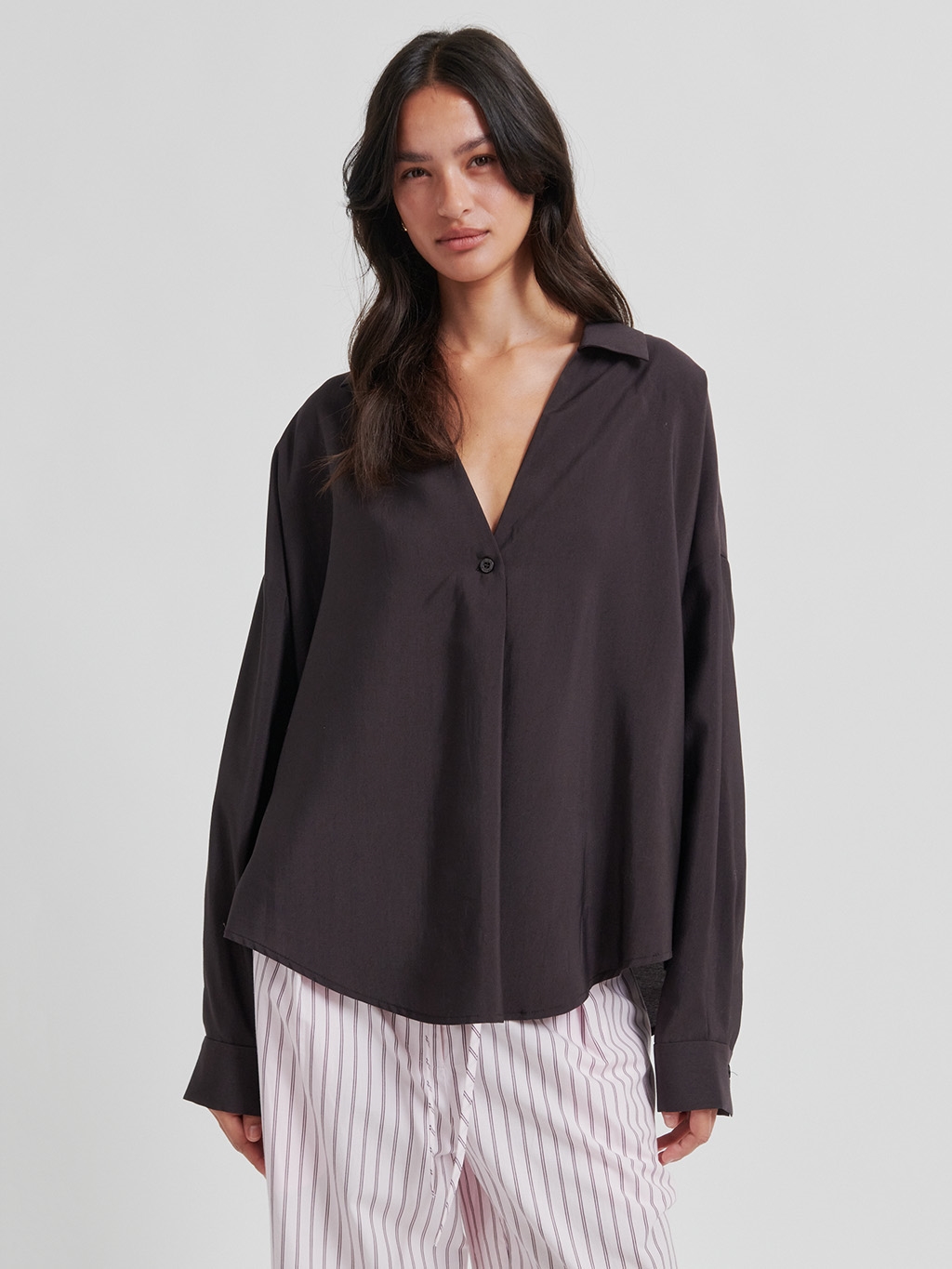 Opdag elegance og komfort med 'Second Female Timeline Blouse' i farven Chocolate Torte. Denne bluse er designet med en sofistikeret krave og en flatterende V-hals, hvilket skaber et tidløst udtryk. Fremstillet i en luksuriøs modalblanding, tilbyder den både blødhed og en draperet effekt. Det løse fit, sammen med lave skuldre og lange ærmer med knappede manchetter, understreger en afslappet, men chic stil. Perfekt til både forår og sommer. Materiale: 88% Modal, 12% Polyester. En must-have til garderoben for den moderne kvinde, der værdsætter kvalitet og stil.
