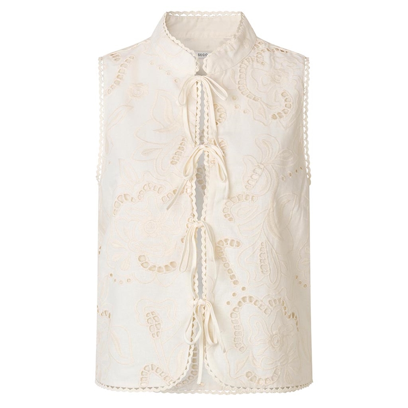 Opdag elegance og komfort med 'Second Female Vilea top Eggnog'. Denne top, designet af Second Female, er fremstillet i en luksuriøs blanding af 80% viskose og 20% hør, hvilket sikrer både holdbarhed og åndbarhed. Med sin unikke kinakrave og åben front prydet med fire sæt dekorative bindebånd, tilbyder denne top en flatterende og justerbar pasform. Det detaljerede cutwork broderi tilføjer et touch af raffinement. Farven eggnog tilfører en blød og alsidig nuance til din forår/sommer garderobe. Ideel til både hverdagsbrug og særlige lejligheder.