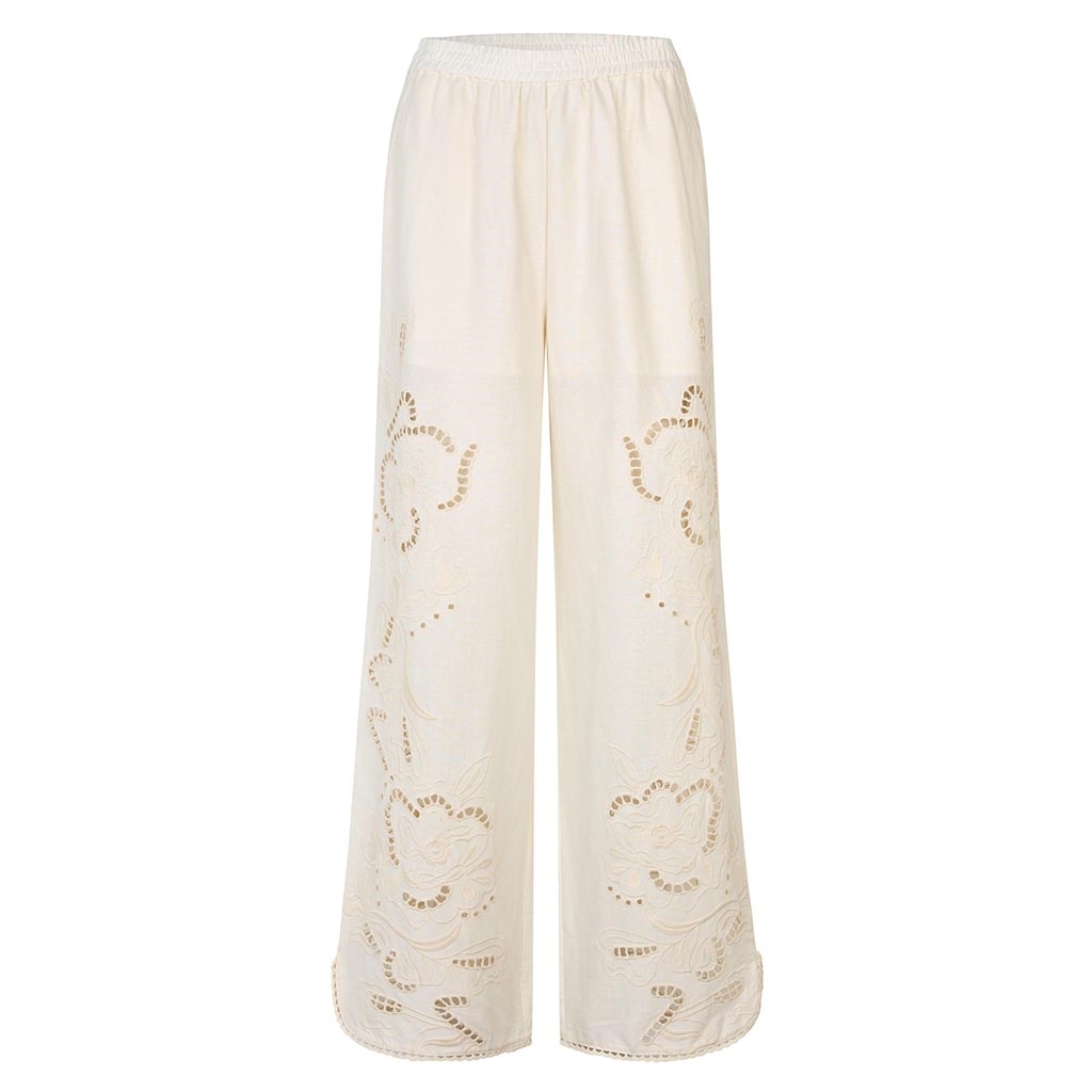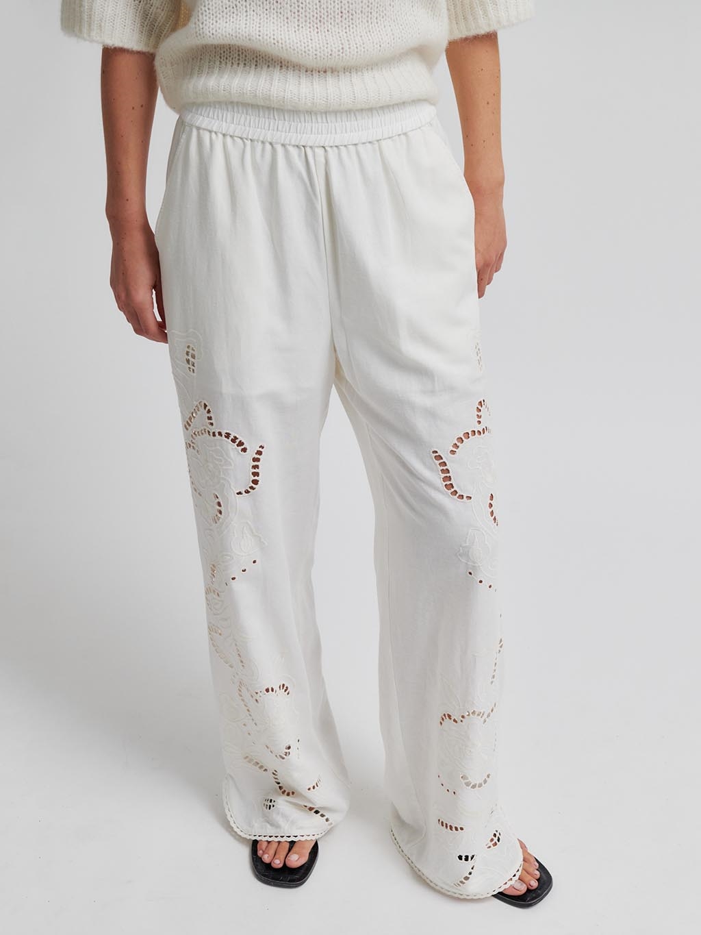 Opdag elegance og komfort med Second Female Vilea Bukser i farven Eggnog. Disse stilfulde bukser er designet i en luksuriøs blanding af 80% viskose og 20% hør, hvilket sikrer både åndbarhed og holdbarhed. Det detaljerede cutwork broderi tilføjer et unikt præg, mens den beklædte elastik i taljen og de praktiske skrå lommer øger komforten. Med en mellemhøj talje og lige, vide ben tilbyder disse bukser en flatterende pasform, perfekt til både forår og sommer. Ideelle til den modebevidste kvinde, der værdsætter både stil og funktionalitet.