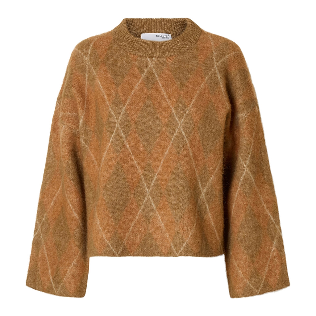 Selected Femme SlfLulu Brushed LS Argyle Knit O-Neck Golden Brown