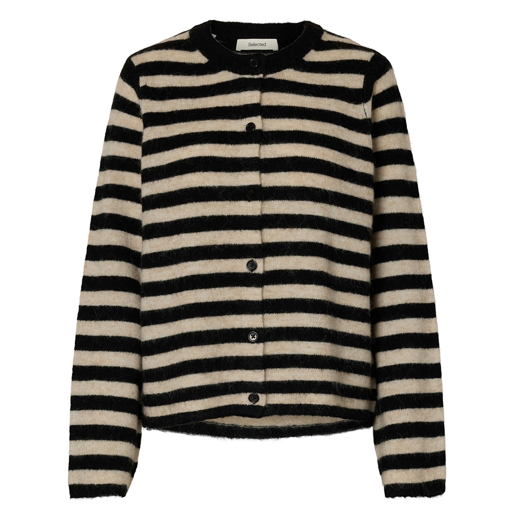 Opgrader din garderobe med 'Selected Femme SlfLulu New LS Knit Cardigan Black Stripe'. Denne stilfulde cardigan er fremstillet af en luksuriøs blanding af 39% uld, inklusiv RWS-certificeret uld, 24% polyester, 20% ansvarlig alpaka, og 15% nylon med 2% elastan for øget komfort. Med dens klassiske sorte striber, rund hals, lange ærmer og praktisk knaplukning, er denne cardigan både funktionel og fashionabel. Den normale pasform sikrer en flatterende silhuet. Perfekt til både efterår/vinter og forår/sommer kollektionerne. Et bæredygtigt valg for den moderne kvinde.