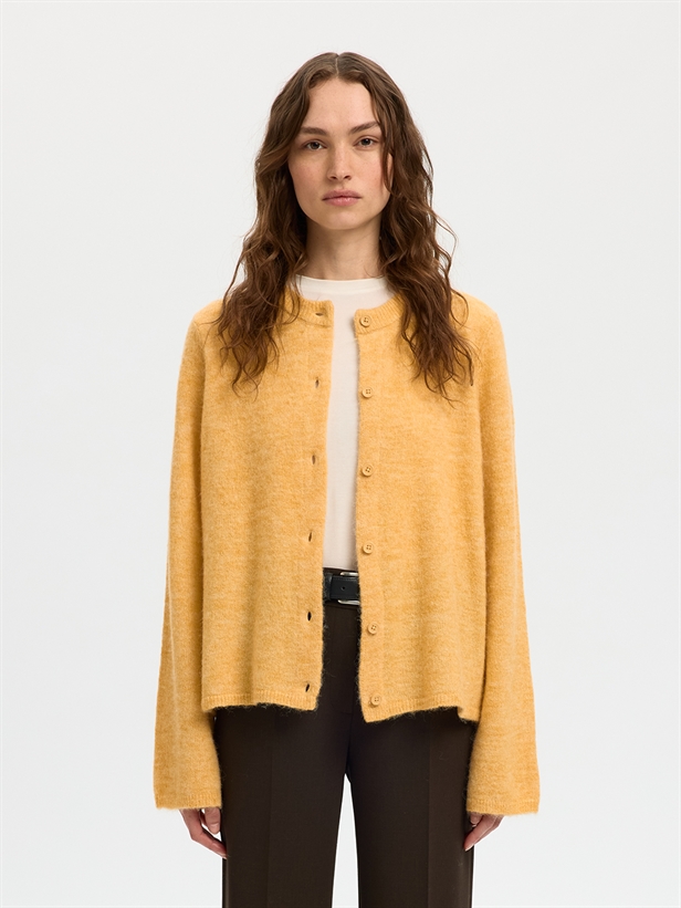 Opdater din garderobe med den stilfulde 'Selected Femme SlfLulu New LS Knit Cardigan Ochre Melange'. Dette tidløse stykke er fremstillet af en luksuriøs blanding af 39% RWS-certificeret uld og 20% Responsible Alpaca Standard alpaka, kombineret med polyester og nylon for holdbarhed og en smule elastan for fleksibilitet. Med lange ærmer, rund hals og praktisk knaplukning tilbyder denne cardigan både komfort og elegance. Farven Ochre Melange tilføjer et varmt pift til både efterårs- og forårsgarderoben. Ideel til den modebevidste kvinde, der værdsætter kvalitet og bæredygtighed.