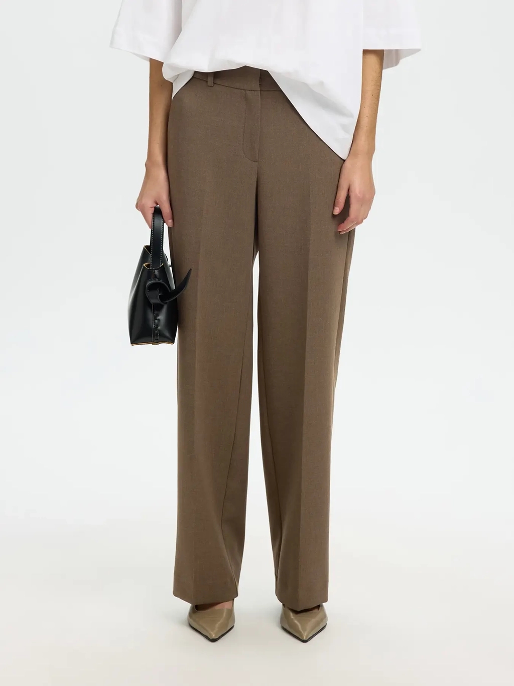 Opdag den stilfulde elegance i 'Selected Femme SlwRita MW Wide Pant Chocolate'. Disse bukser er fremstillet af 50% genanvendt polyester, 41% bæredygtig LENZING™ ECOVERO™ viskose og 9% elastan, hvilket sikrer både komfort og miljøansvarlighed. Med en bred benlængde og regulær pasform tilbyder de en afslappet, men flatterende silhuet. Detaljer inkluderer praktiske sidelommer og en diskret lynlåslukning. Perfekte til både forår og sommer, er de et ideelt valg for den modebevidste kvinde, der værdsætter kvalitet og bæredygtighed.