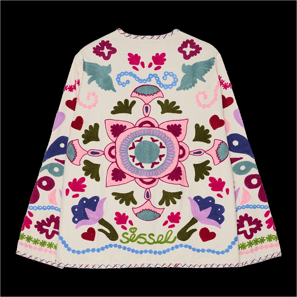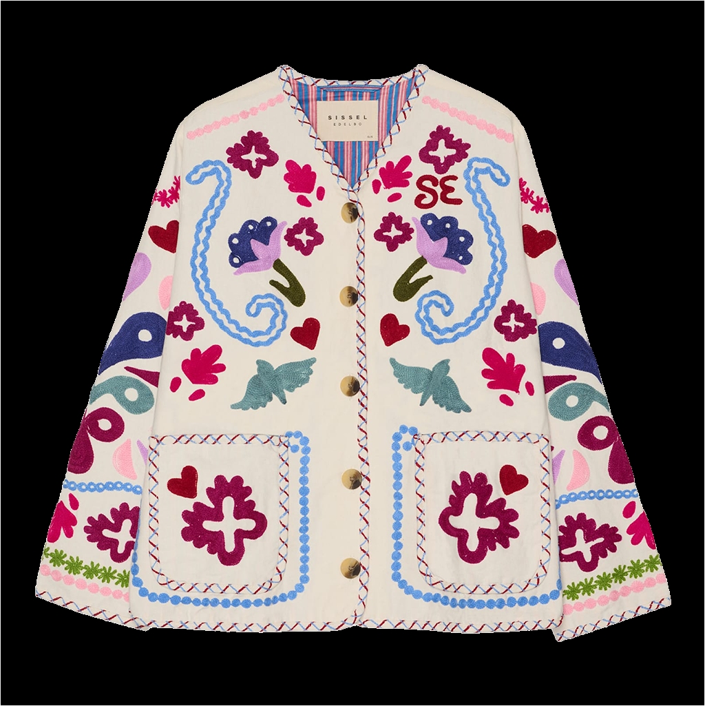 Oplev Sissel Edelbo Maggie Jacket Flower Festival, en skøn jakke der forener stil og bæredygtighed. Dette unikke stykke tøj er fremstillet af 100% økologisk bomuld og præsenterer et iøjnefaldende Suzani-broderi med blomster, små hjerter og en fredsdue. Jakken tilbyder en afslappet pasform, komplet med fuld længde på 70 cm og brystmål på 120 cm, samt praktiske forlommer og knaplukning. Perfekt til forår/sommer kollektionen, kombinerer den komfort og etisk mode med sit flerfarvede design og økologiske materialer. Ideal til den modebevidste kvinde, der værdsætter kvalitet og bæredygtighed.