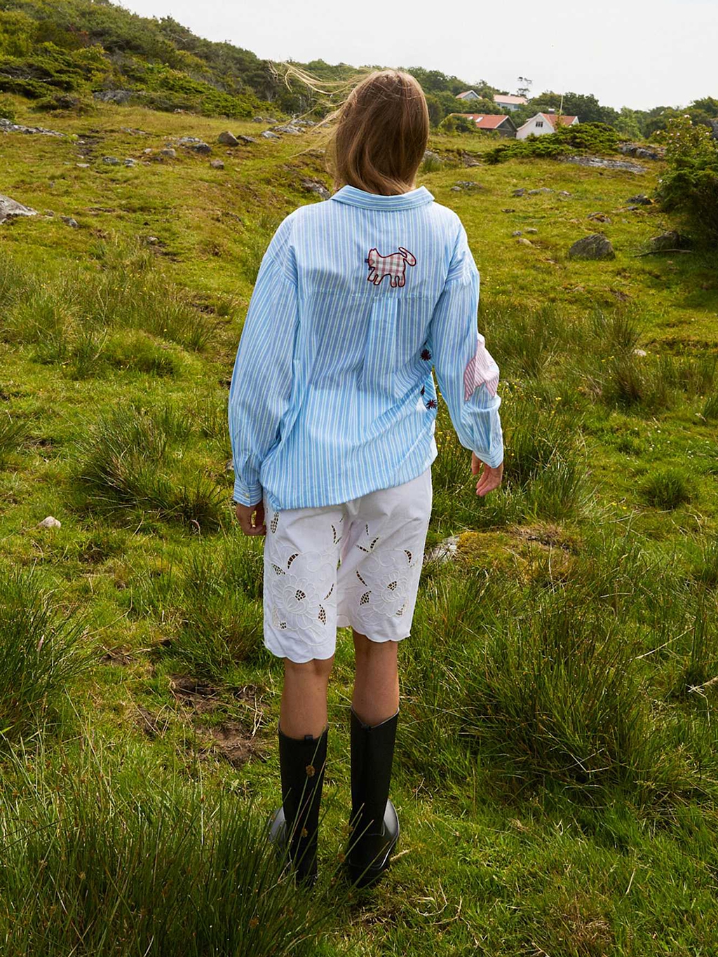 Opdag den charmerende 'Sissel Edelbo Pil Shirt Green Stripes', perfekt til forårs- og sommergarderoben. Denne skjorte præsenterer en løs, lige pasform med brede skuldre, fremstillet af bæredygtige restmaterialer i garnfarvede bomuldsstriber. Det klassiske design inkluderer lange ærmer med manchetter, en skarp skjortekrave, og stolpelukning foran, mens den buede kant tilføjer et feminint touch. Udsmykket med unikke broderier af dyremotiver, kombinerer denne flerfarvede skjorte stil med ansvarlighed. Materialebeskrivelsen lover både komfort og holdbarhed, ideel for den moderne, miljøbevidste kvinde.