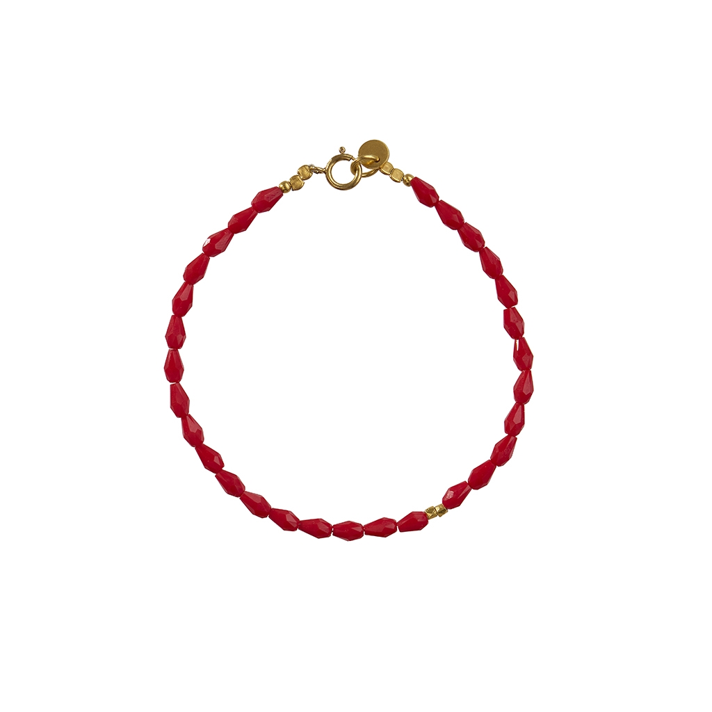 Opdag 'Stine A Miss Paris Bracelet - Boheme', en ekstravagant tilføjelse til enhver garderobe. Dette armbånd er prydet med imponerende røde ædelsten i varierede former, der tilføjer en sprudlende og farverig nuance til dit håndled. Fremstillet af 18 karat forgyldt 925 sterlingsølv og dekoreret med glasperler, kombinerer det håndværksmæssig finesse med et moderne touch. Perfekt til den stilbevidste kvinde, der ønsker at tilføre et strejf af boheme-chik til sit look. Justerbar omkreds på 17–25 cm sikrer en ideel pasform for alle.