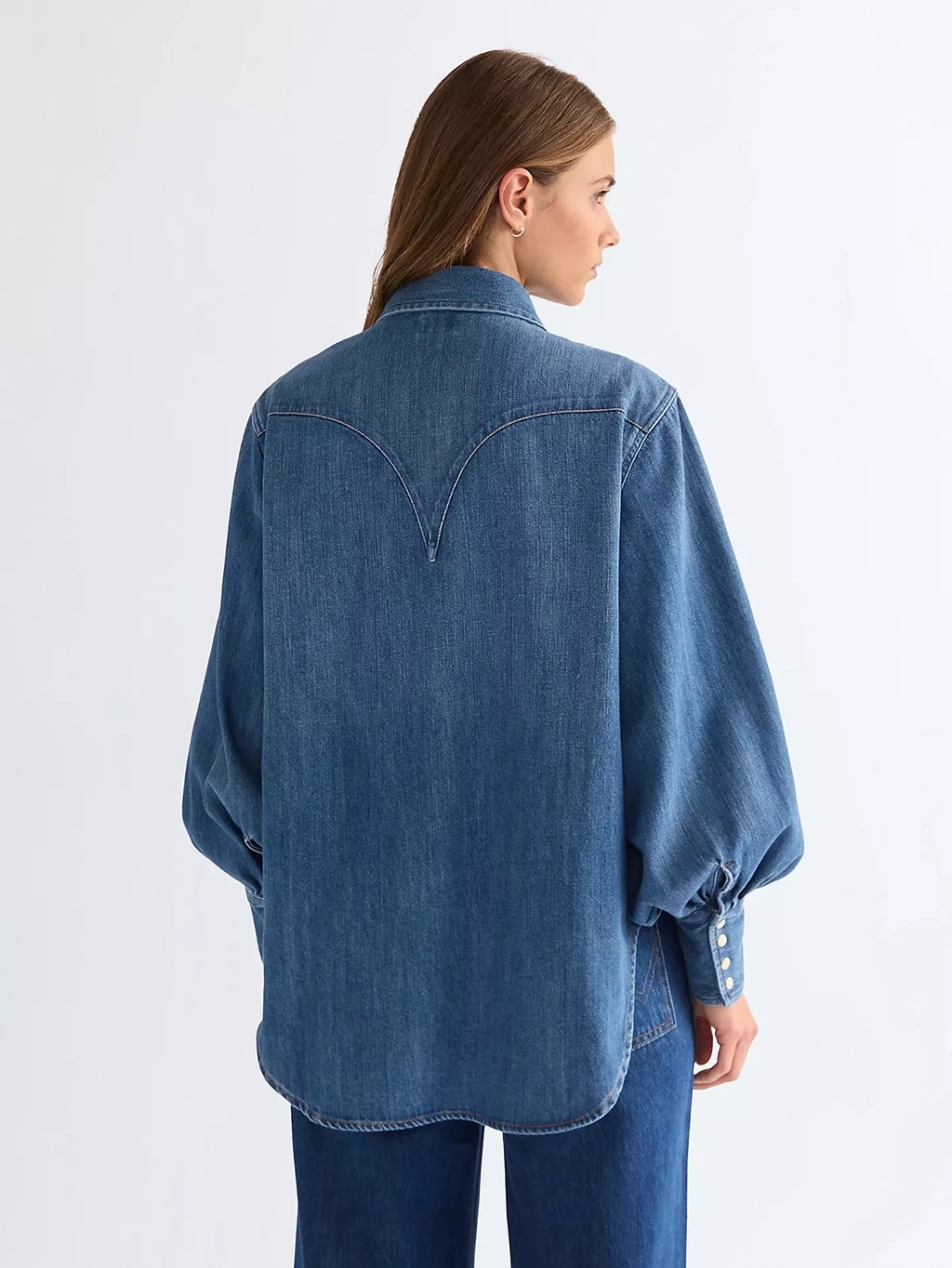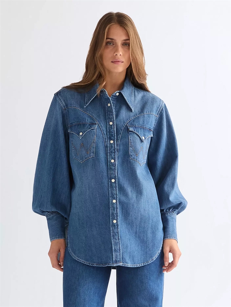 Oplev den ikoniske 'Wrangler Relaxed Exaggerated Western Lightweight Shirt Court Classic' for kvinder. Denne langærmede skjorte, fremstillet af 100% regenerativ bomuld, kombinerer bæredygtighed med stil. Det lette denimstof og de karakteristiske 'W'-syninger samt detaljerede western-ytterstykker på både for- og bagside, fejrer den amerikanske arv. Designet med en afslappet pasform og ballonærmer, tilbyder denne blå skjorte både komfort og elegance. Perfekt for alle sæsoner, den er en must-have i enhver garderobe